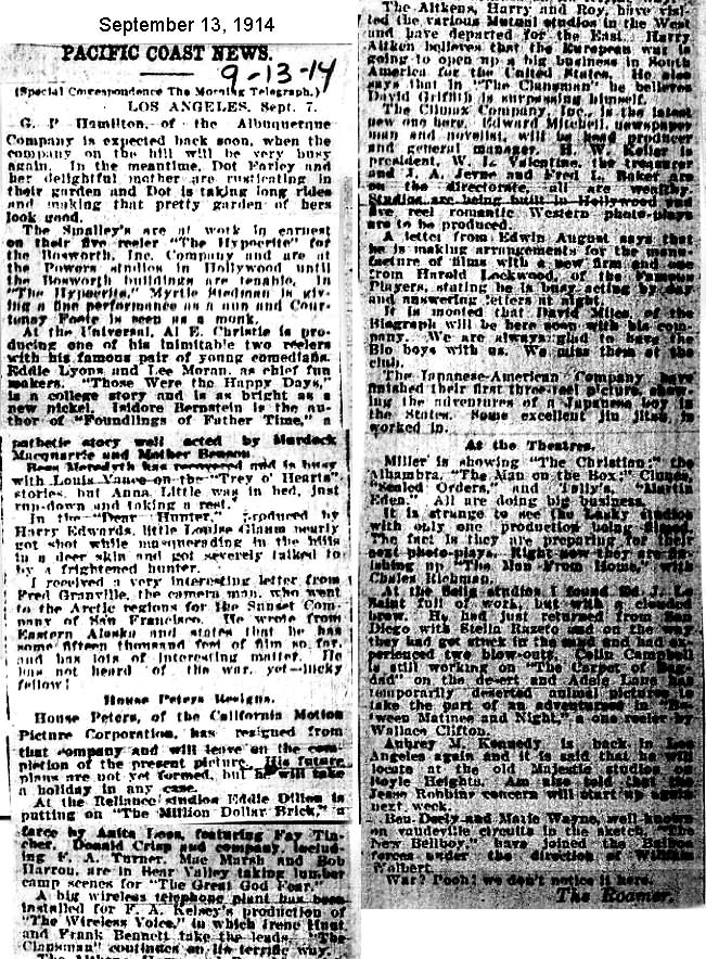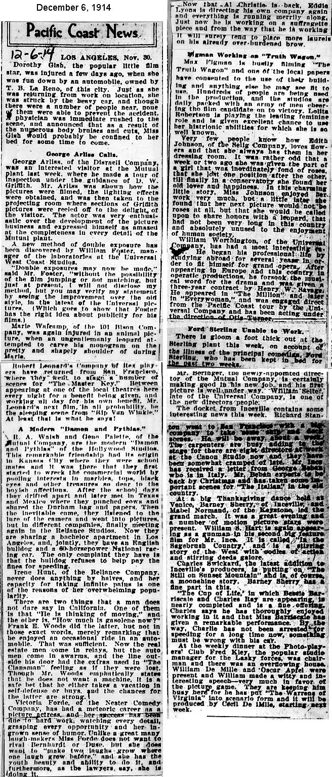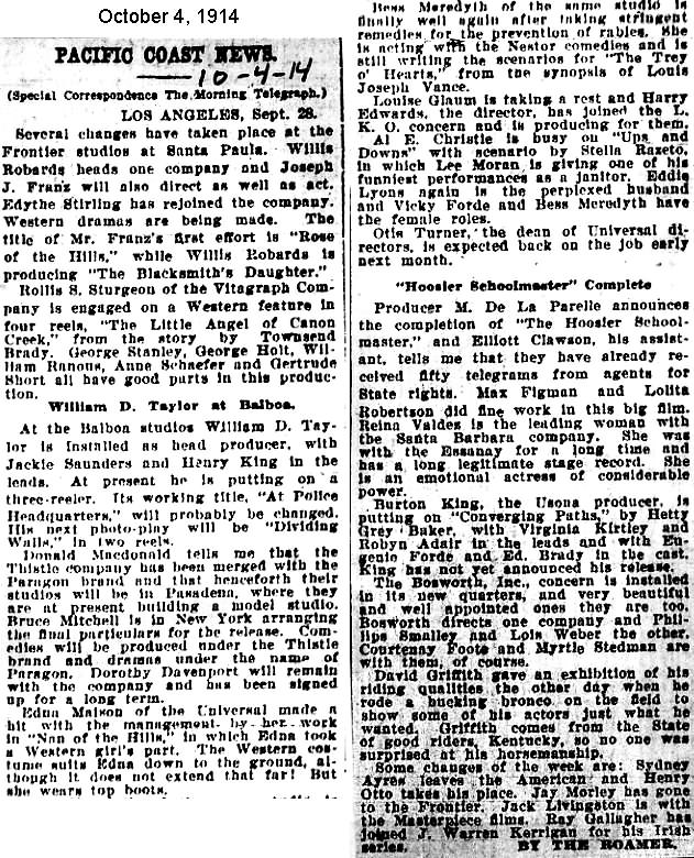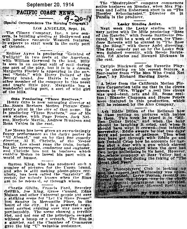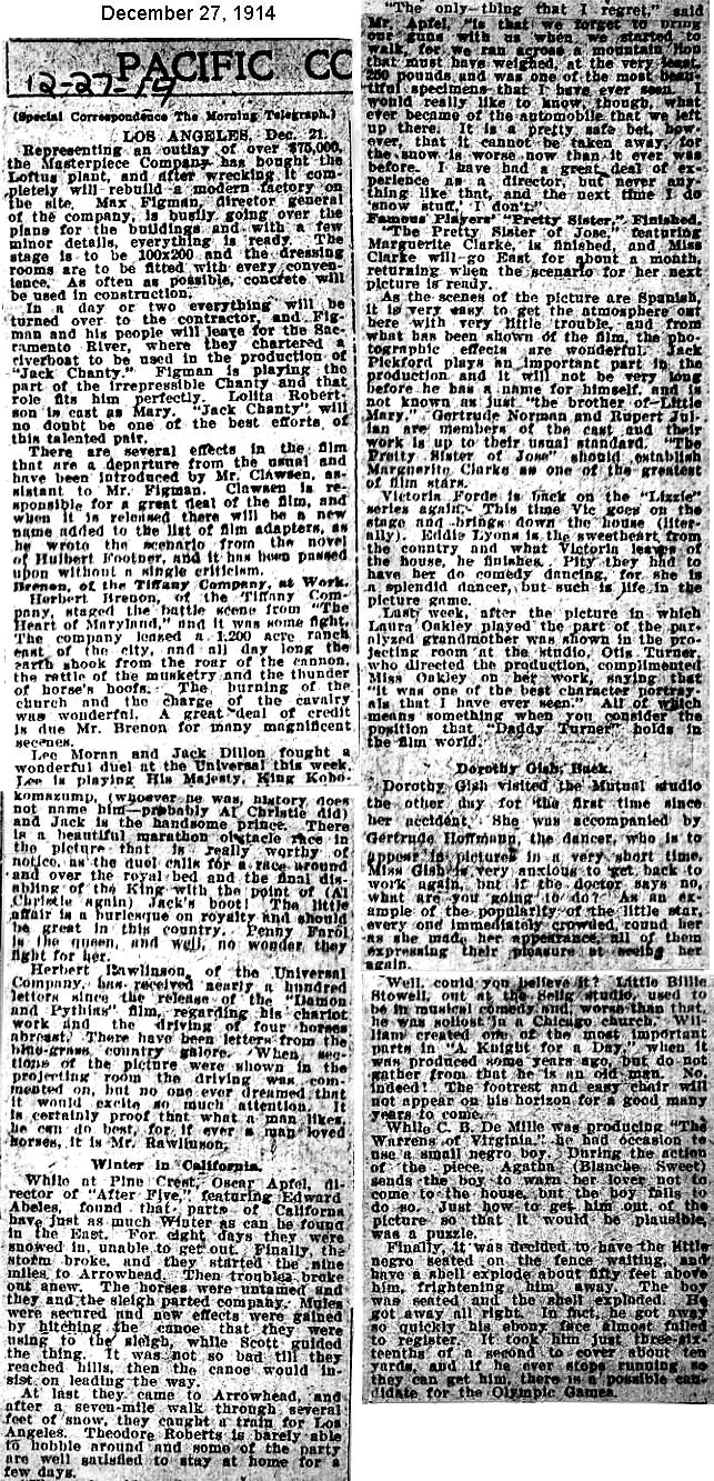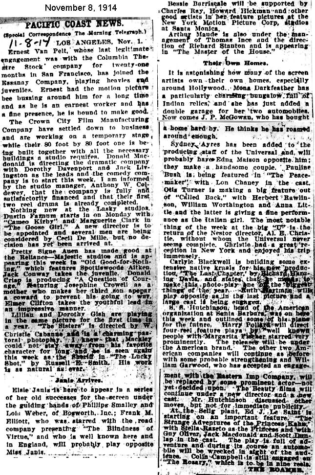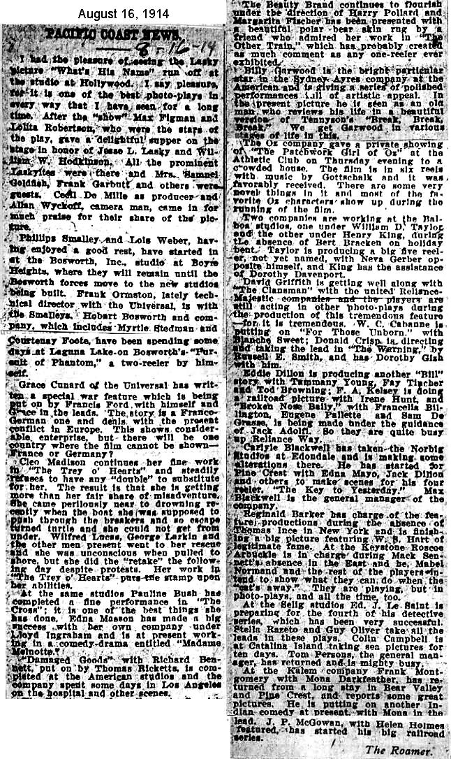 During the silent film era, the New York Morning Telegraph had more coverage of the film industry than any other daily New York newspaper; its coverage included a weekly column of movie news from Los Angeles, initially titled “Pacific Coast News.” As the film industry in Hollywood expanded, that column also grew in size. Many of the “news items” came directly from publicity agents, but they still provide a useful historic glimpse into Hollywood’s growing silent film industry. Major Hollywood news stories would have been given separate articles instead of a mention inside this column. The columnists of “Pacific Coast News” included Edward V. Durling, Clem Pope, Margaret Ettinger and Frances Agnew. During the 1980s, when I was seeking information on the film career of William Desmond Taylor, I cast my research net through a good number of newspapers, fan magazines, and movie trade publications. Since Taylor was directing in Southern California, I was surprised to find so many items on Taylor in the New York Morning Telegraph, which I had examined on microfilm obtained through interlibrary loan. Those columns of “Pacific Coast News” had so much information, and were so useful to me, that I photocopied them for future silent film references. Now, instead of just gathering dust in my garage, I have scanned those 1914-1922 “Pacific Coast News” columns for the web, so that anyone who is interested in silent film history will have access to the material. I did not photocopy the columns beyond February 1922, and the column was occasionally missing from the microfilm source material. Obviously, this material would be more useful if it were turned into word-searchable text instead of images. With the increasing availability of large amounts of free web space such as the Internet Archive, all available contemporary publications on silent film should be scanned and made freely available online, and I encourage people with copies of other contemporary silent film material to do so. In any event, I hope some of you will find useful information in these columns from the New York Morning Telegraph.
