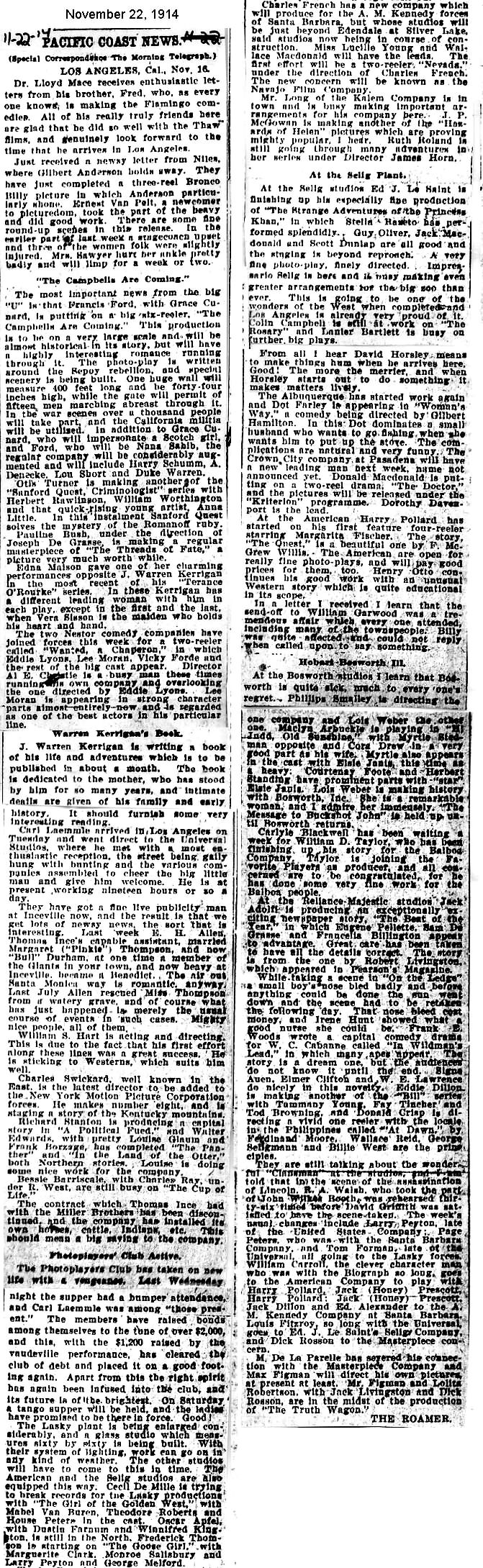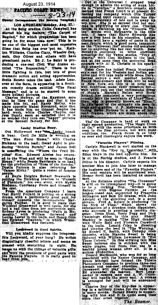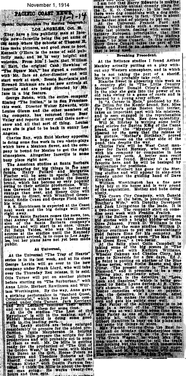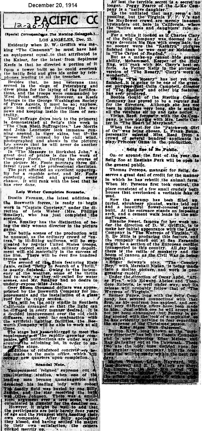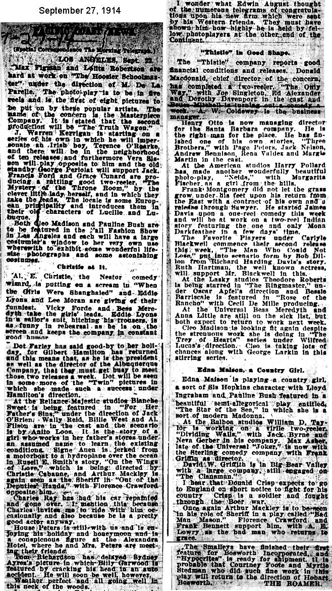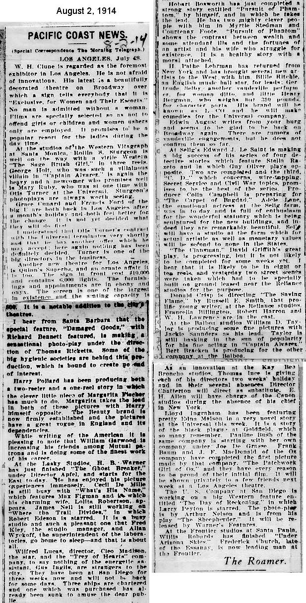 During the silent film era, the New York Morning Telegraph had more coverage of the film industry than any other daily New York newspaper; its coverage included a weekly column of movie news from Los Angeles, initially titled “Pacific Coast News.” As the film industry in Hollywood expanded, that column also grew in size. Many of the “news items” came directly from publicity agents, but they still provide a useful historic glimpse into Hollywood’s growing silent film industry. Major Hollywood news stories would have been given separate articles instead of a mention inside this column. The columnists of “Pacific Coast News” included Edward V. Durling, Clem Pope, Margaret Ettinger and Frances Agnew. During the 1980s, when I was seeking information on the film career of William Desmond Taylor, I cast my research net through a good number of newspapers, fan magazines, and movie trade publications. Since Taylor was directing in Southern California, I was surprised to find so many items on Taylor in the New York Morning Telegraph, which I had examined on microfilm obtained through interlibrary loan. Those columns of “Pacific Coast News” had so much information, and were so useful to me, that I photocopied them for future silent film references. Now, instead of just gathering dust in my garage, I have scanned those 1914-1922 “Pacific Coast News” columns for the web, so that anyone who is interested in silent film history will have access to the material. I did not photocopy the columns beyond February 1922, and the column was occasionally missing from the microfilm source material. Obviously, this material would be more useful if it were turned into word-searchable text instead of images. With the increasing availability of large amounts of free web space such as the Internet Archive, all available contemporary publications on silent film should be scanned and made freely available online, and I encourage people with copies of other contemporary silent film material to do so. In any event, I hope some of you will find useful information in these columns from the New York Morning Telegraph.