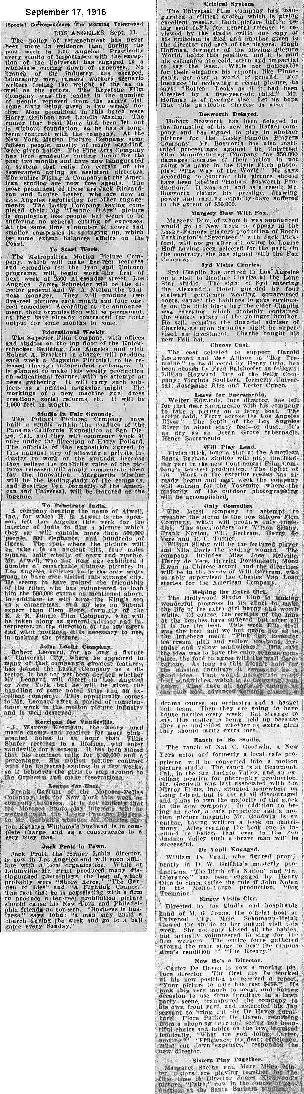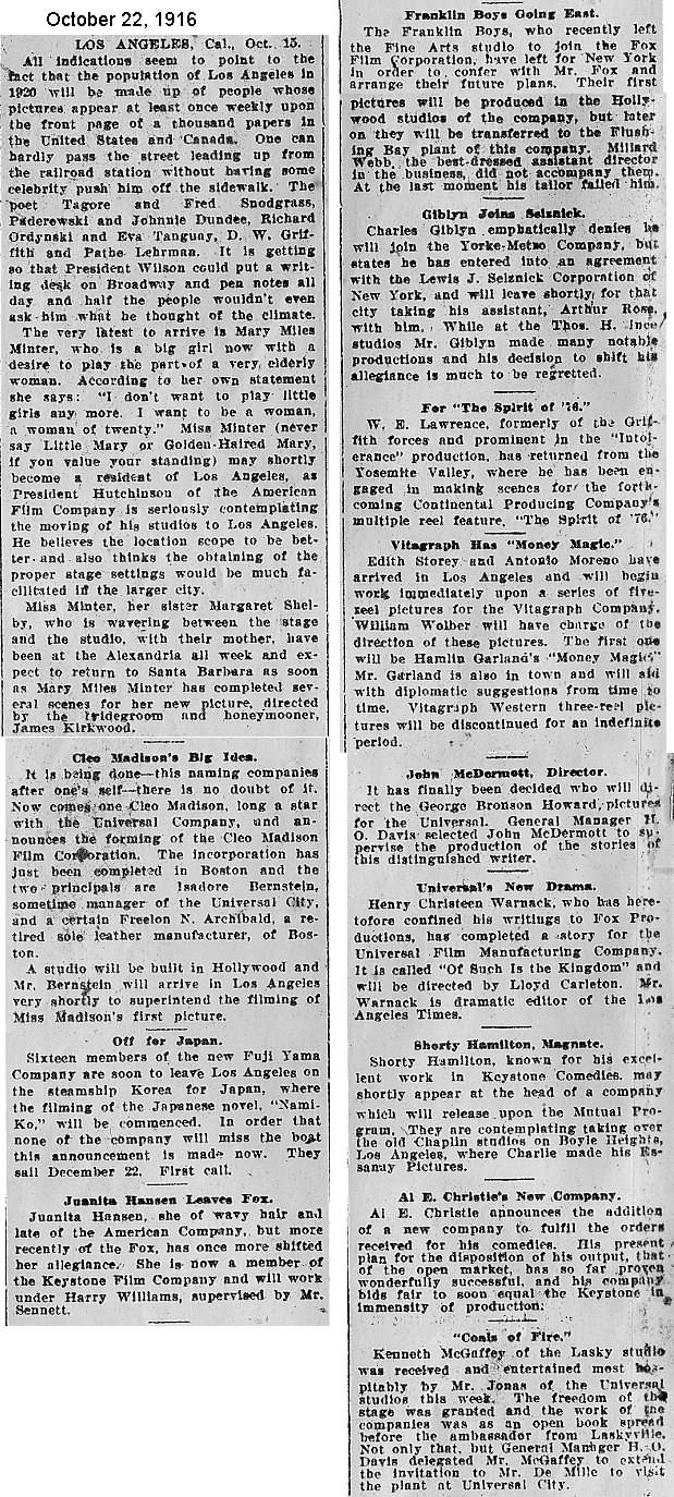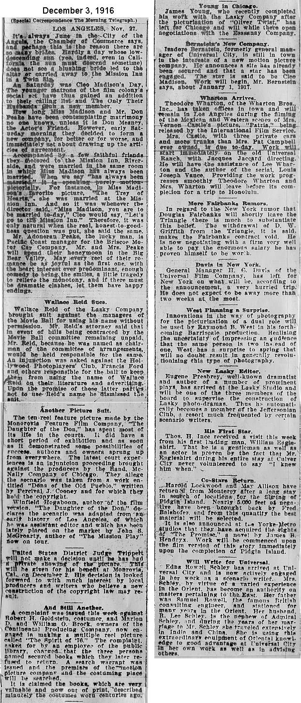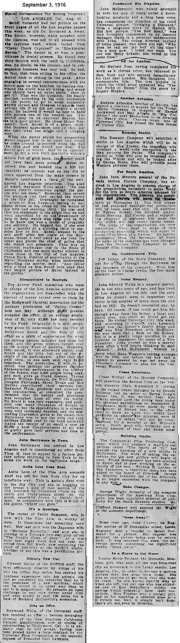 During the silent film era, the New York Morning Telegraph had more coverage of the film industry than any other daily New York newspaper; its coverage included a weekly column of movie news from Los Angeles, initially titled “Pacific Coast News.” As the film industry in Hollywood expanded, that column also grew in size. Many of the “news items” came directly from publicity agents, but they still provide a useful historic glimpse into Hollywood’s growing silent film industry. Major Hollywood news stories would have been given separate articles instead of a mention inside this column. The columnists of “Pacific Coast News” included Edward V. Durling, Clem Pope, Margaret Ettinger and Frances Agnew. During the 1980s, when I was seeking information on the film career of William Desmond Taylor, I cast my research net through a good number of newspapers, fan magazines, and movie trade publications. Since Taylor was directing in Southern California, I was surprised to find so many items on Taylor in the New York Morning Telegraph, which I had examined on microfilm obtained through interlibrary loan. Those columns of “Pacific Coast News” had so much information, and were so useful to me, that I photocopied them for future silent film references. Now, instead of just gathering dust in my garage, I have scanned those 1914-1922 “Pacific Coast News” columns for the web, so that anyone who is interested in silent film history will have access to the material. I did not photocopy the columns beyond February 1922, and the column was occasionally missing from the microfilm source material. Obviously, this material would be more useful if it were turned into word-searchable text instead of images. With the increasing availability of large amounts of free web space such as the Internet Archive, all available contemporary publications on silent film should be scanned and made freely available online, and I encourage people with copies of other contemporary silent film material to do so. In any event, I hope some of you will find useful information in these columns from the New York Morning Telegraph.