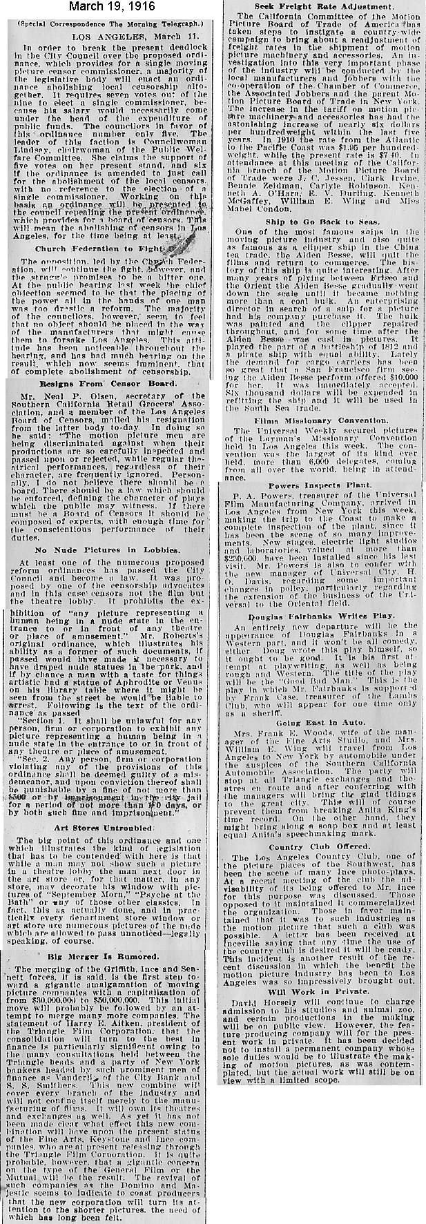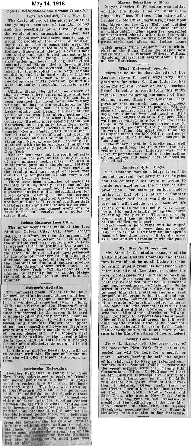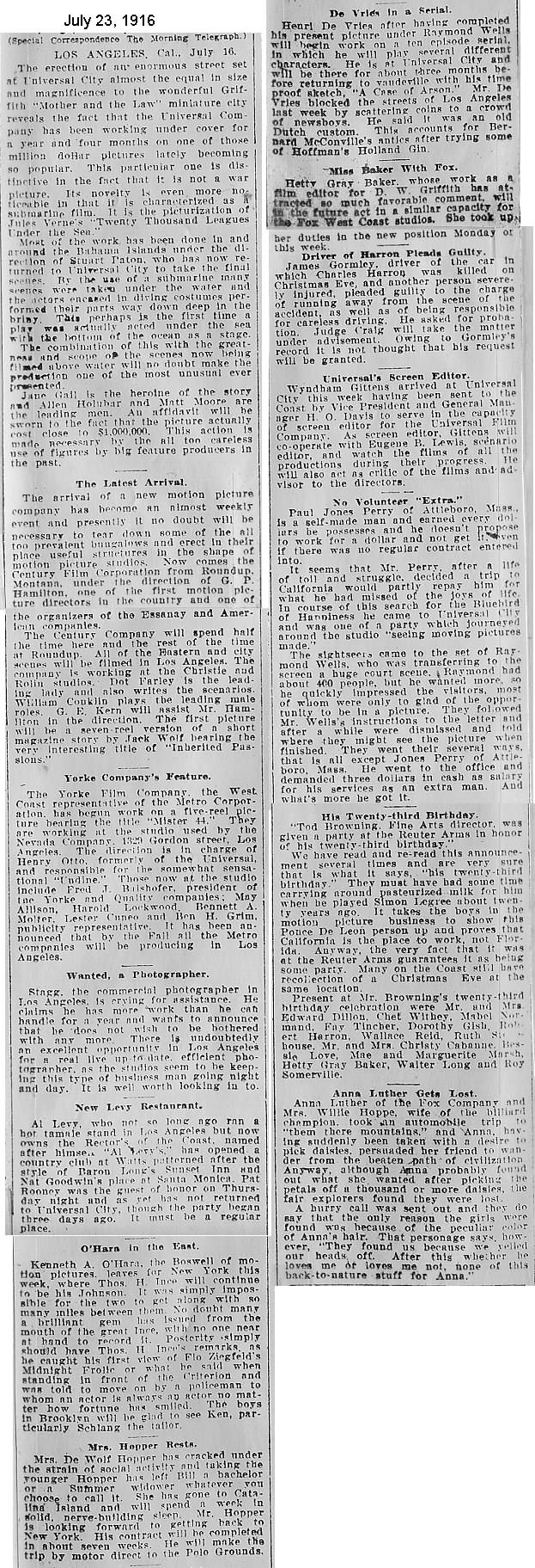 During the silent film era, the New York Morning Telegraph had more coverage of the film industry than any other daily New York newspaper; its coverage included a weekly column of movie news from Los Angeles, initially titled “Pacific Coast News.” As the film industry in Hollywood expanded, that column also grew in size. Many of the “news items” came directly from publicity agents, but they still provide a useful historic glimpse into Hollywood’s growing silent film industry. Major Hollywood news stories would have been given separate articles instead of a mention inside this column. The columnists of “Pacific Coast News” included Edward V. Durling, Clem Pope, Margaret Ettinger and Frances Agnew. During the 1980s, when I was seeking information on the film career of William Desmond Taylor, I cast my research net through a good number of newspapers, fan magazines, and movie trade publications. Since Taylor was directing in Southern California, I was surprised to find so many items on Taylor in the New York Morning Telegraph, which I had examined on microfilm obtained through interlibrary loan. Those columns of “Pacific Coast News” had so much information, and were so useful to me, that I photocopied them for future silent film references. Now, instead of just gathering dust in my garage, I have scanned those 1914-1922 “Pacific Coast News” columns for the web, so that anyone who is interested in silent film history will have access to the material. I did not photocopy the columns beyond February 1922, and the column was occasionally missing from the microfilm source material. Obviously, this material would be more useful if it were turned into word-searchable text instead of images. With the increasing availability of large amounts of free web space such as the Internet Archive, all available contemporary publications on silent film should be scanned and made freely available online, and I encourage people with copies of other contemporary silent film material to do so. In any event, I hope some of you will find useful information in these columns from the New York Morning Telegraph.