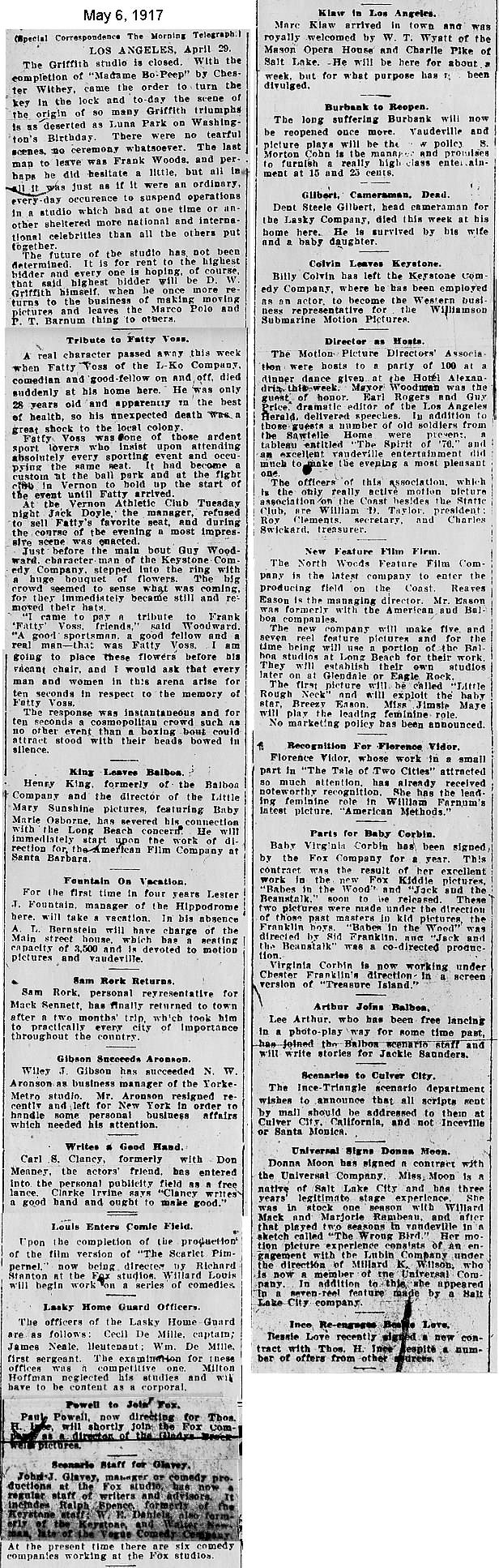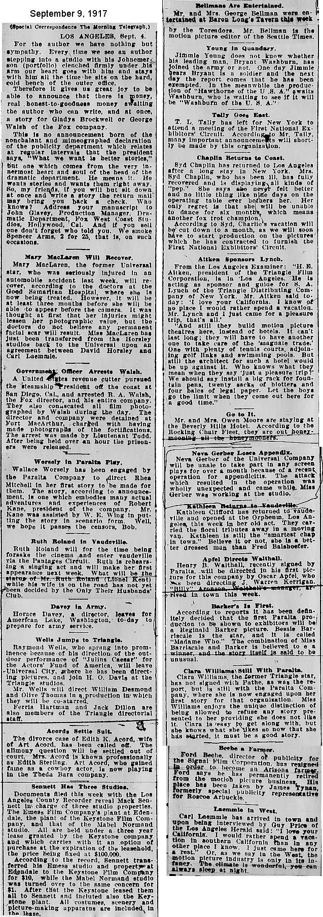 During the silent film era, the New York Morning Telegraph had more coverage of the film industry than any other daily New York newspaper; its coverage included a weekly column of movie news from Los Angeles, initially titled “Pacific Coast News.” As the film industry in Hollywood expanded, that column also grew in size. Many of the “news items” came directly from publicity agents, but they still provide a useful historic glimpse into Hollywood’s growing silent film industry. Major Hollywood news stories would have been given separate articles instead of a mention inside this column. The columnists of “Pacific Coast News” included Edward V. Durling, Clem Pope, Margaret Ettinger and Frances Agnew. During the 1980s, when I was seeking information on the film career of William Desmond Taylor, I cast my research net through a good number of newspapers, fan magazines, and movie trade publications. Since Taylor was directing in Southern California, I was surprised to find so many items on Taylor in the New York Morning Telegraph, which I had examined on microfilm obtained through interlibrary loan. Those columns of “Pacific Coast News” had so much information, and were so useful to me, that I photocopied them for future silent film references. Now, instead of just gathering dust in my garage, I have scanned those 1914-1922 “Pacific Coast News” columns for the web, so that anyone who is interested in silent film history will have access to the material. I did not photocopy the columns beyond February 1922, and the column was occasionally missing from the microfilm source material. Obviously, this material would be more useful if it were turned into word-searchable text instead of images. With the increasing availability of large amounts of free web space such as the Internet Archive, all available contemporary publications on silent film should be scanned and made freely available online, and I encourage people with copies of other contemporary silent film material to do so. In any event, I hope some of you will find useful information in these columns from the New York Morning Telegraph.